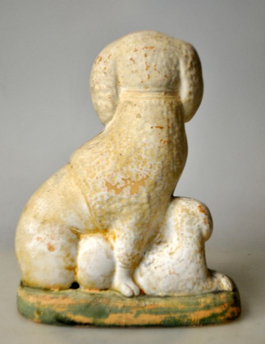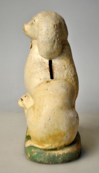 Spardose aus kalt bemaltem Ton, 19. Jahrhundert. Bornholm. Dänemark. Spardose in Form eines Pudels mit zwei Welpen. H.: 18 cm.