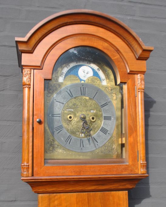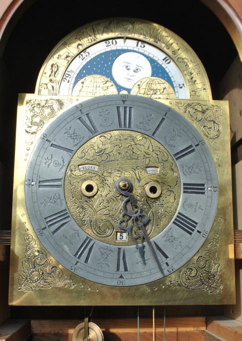 Dänische Standuhr, 20. Jahrhundert. Uhrenhersteller Anker Luplau Dinesen, Randers. Nr.: 325. Standuhr aus Mahagoni mit Gehäuse und Viertelsäulen. Uhrwerk mit Mondphase und Kalender mit Monats- und Datumsanzeige. Mit Stundenzeigern. Messingzifferblatt mit römischen Ziffern. Höhe: 210 cm. Breite: 44 cm. Tiefe: 24 cm.