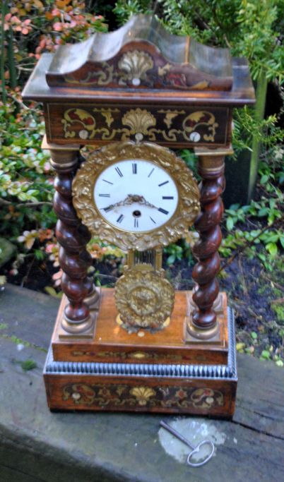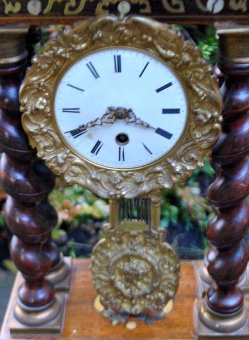 Säulenuhr aus Ebenholz, Messing und mit Intarsien, um 1830. Frankreich.