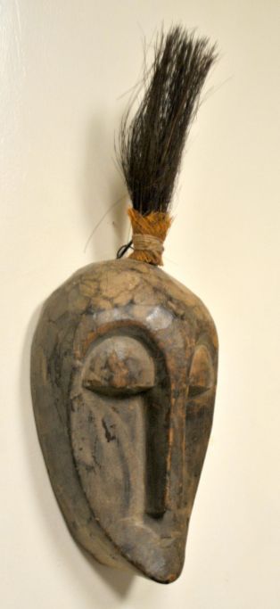 Kleine, geschnitzte afrikanische Holzmaske, Mitte des 20. Jahrhunderts. Oberseite aus Tierhaar. Höhe: 30 cm.