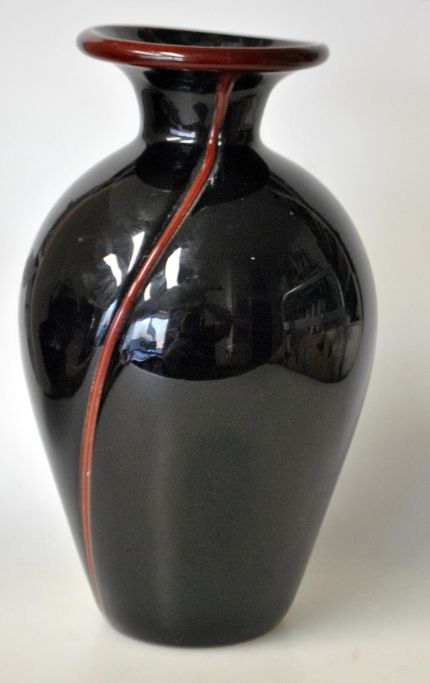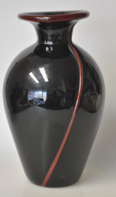 Vase aus schwarzem Glas, 20. Jahrhundert. Schwarz mit rotbraunen Streifen. Höhe: 19,5 cm. Ohne Stempel.
