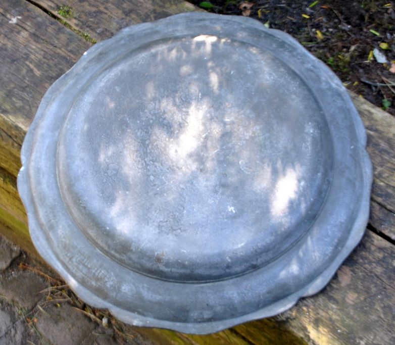 Große Zinnschale im Rokokol aus dem 18. Jahrhundert. Durchmesser: 37 cm. Keine sichtbaren Stempel.